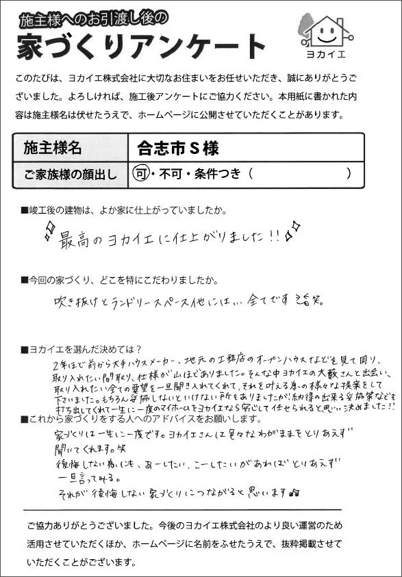もちろん妥協しないといけない所もありましたが、納得のできる妥協策なども打ち出してくれて、一生に一度のマイホームをヨカイエなら安心して 任せられると思い、決めました!!