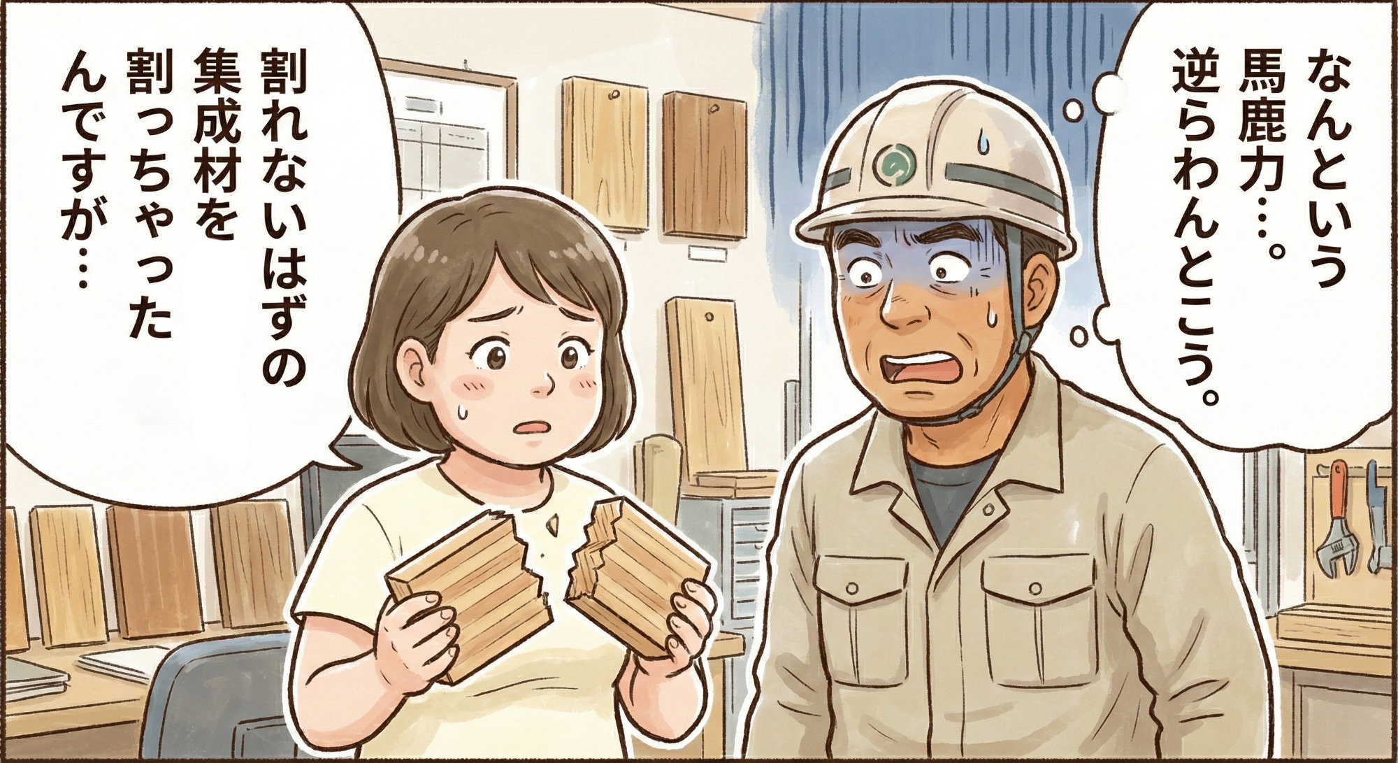 乾燥した無垢材は、ビックリするほどパリパリ割れてしまいます!ところが集成材はかなり力を入れてもなかなか割ることができません。同じ厚みであっても、集成材のほうが圧倒的に強度があることがわかります。