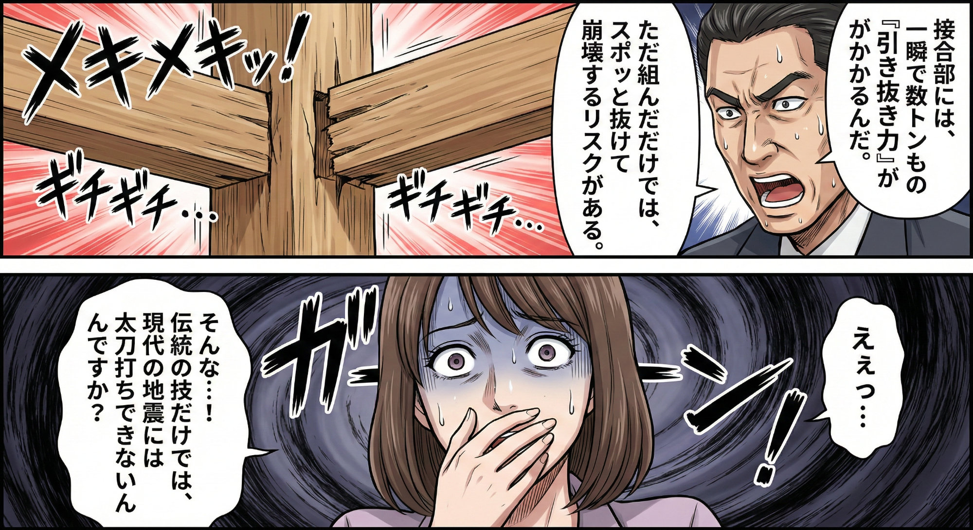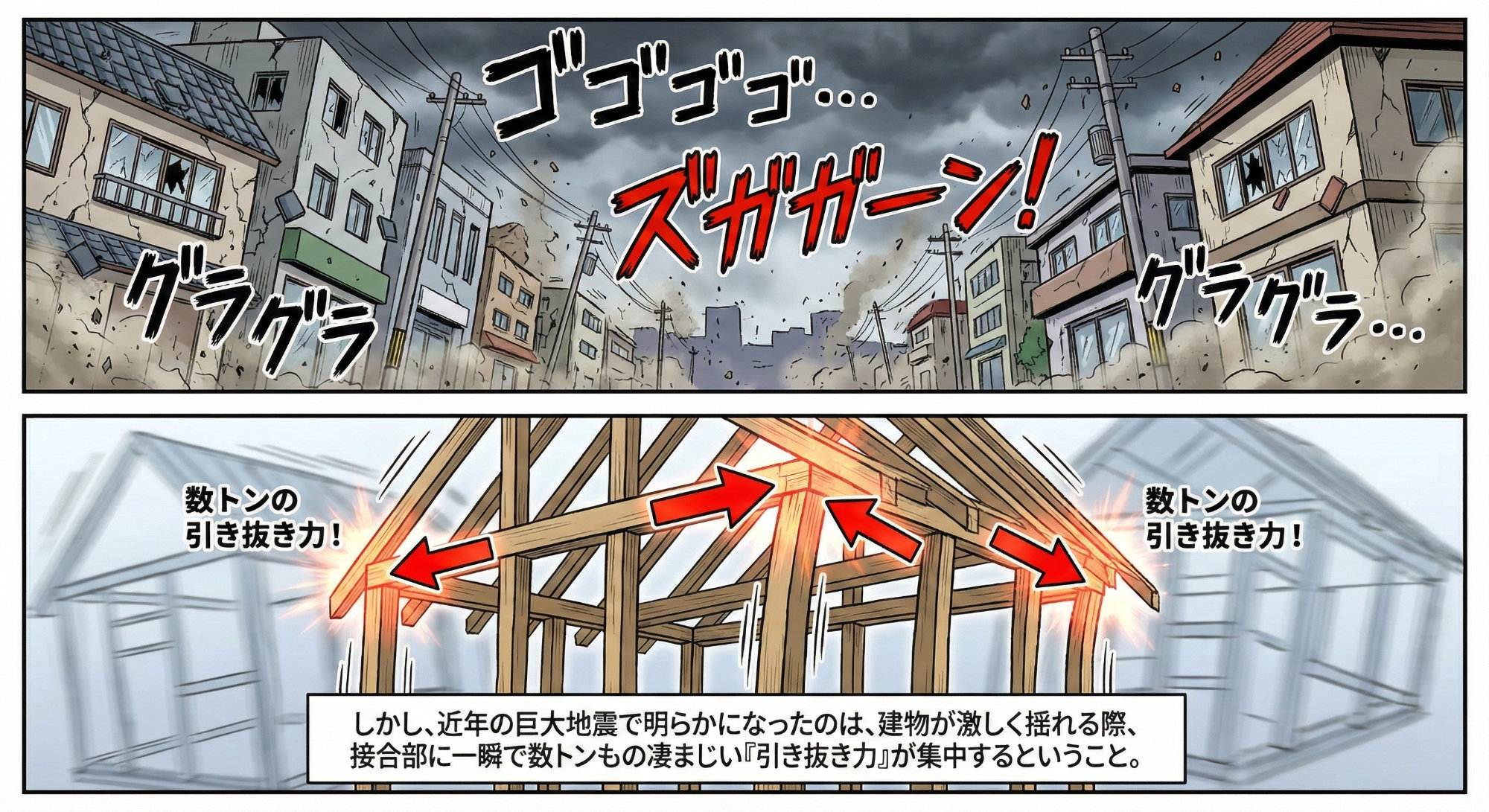 しかし、現代の建築基準法が求める圧倒的な耐震性能の前では、こうした木の加工だけではどうしても「接合部の強度」を数値化・保証することが困難です。特に、近年の巨大地震で明らかになったのは、建物が激しく揺れる際、接合部に一瞬で数トンもの凄まじい「引き抜き力」が集中するということ。