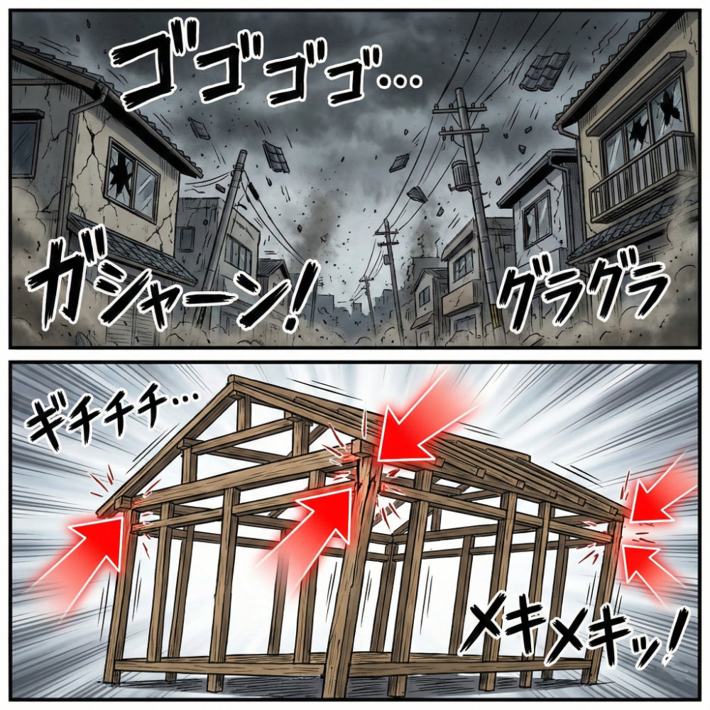 阪神・淡路大震災では、多くの木造住宅が「柱が土台から抜ける」ことで倒壊しました。建物が揺れる際、特に建物の角にある柱には、上に向かって引き抜こうとする強い力が働きます。