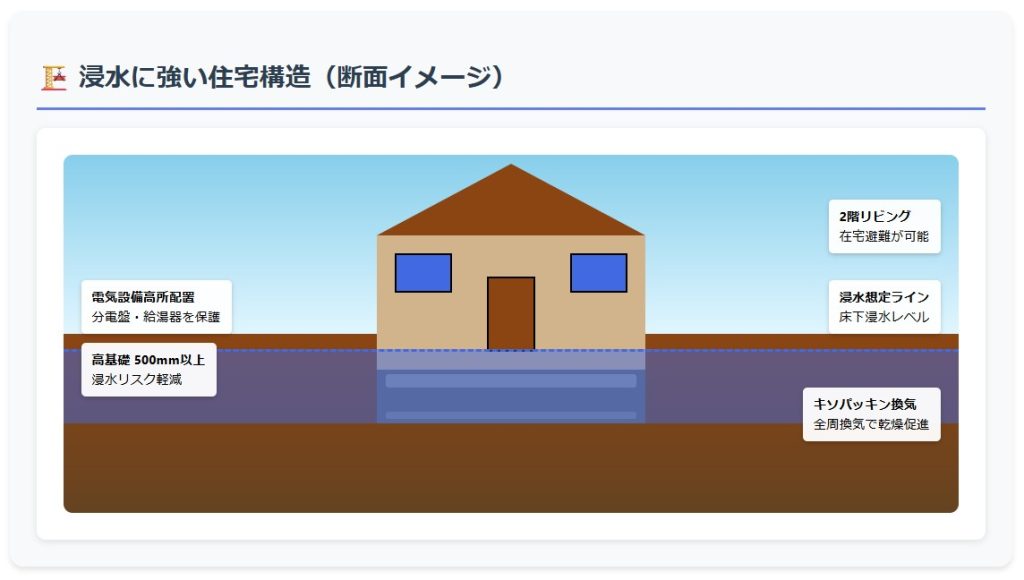 浸水リスクのある地域では、主要な生活空間を2階に配置する「2階リビング」の間取りも検討価値があります。1階が浸水しても、2階で生活を継続できる「在宅避難」が可能になります。