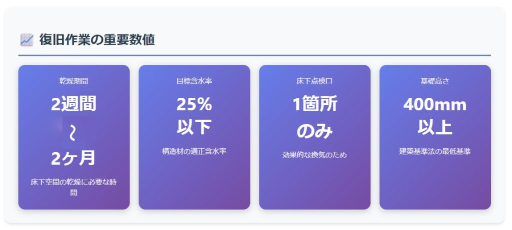 水の排出後、最も重要なのが乾燥作業です。高湿度状態のまま放置すると、カビの発生や木材の腐朽が進行します。
