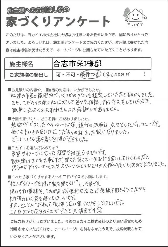 ”住んでるイメージを持って家を建てる!!”という事です。使いやすい動線や、これがあったら便利だななど想像を膨らませながら納得のいく家を建ててほしいです。また、とことんこだわって後悔しない家づくりをしてほしいです。こんなステキなヨカイエができて大満足です☺
