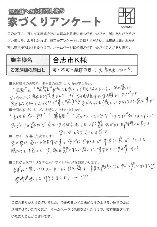 夫の知り合いの紹介です。 今ではヨカイエで本当に良かった!!と思っていますのでお家を建てたい友人にすすめていきます💨💨