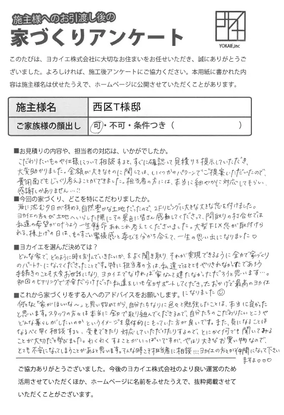何となく「家がほしいな~」と思い始めてから、自分たちなりに色々と勉強したことは、本当に良かったと思います。スタッフの方々は本当に全力で取り組んでくださるので、自分たちのこだわりたいところやどんな暮らしがしたいのかというイメージを具体的にもっていた方が良いです。また、気になることはなるべく早く相談すると、変更できたり対応していただけたりするので、とにかく何でも聞いてみることが大切だと学びました。わくわくすることがいっぱいですが、やはり大きなお買い物なので、とても不安になってしまうことがあると思います。そんな時こそ担当者に相談!!!ヨカイエの方々が仲間になって下さいますよ❤❤❤